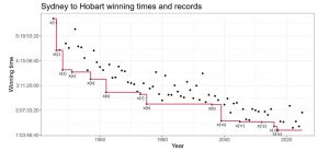 Every year on Boxing day at noon hundreds of yachts line up in Sydney harbour before a cannon is fired and the annual Sydney to Hobart yacht race takes off with the goal of setting a new record for the fastest time to sail from Sydney to Hobart. Throughout its 80 year history there have been 14 new record times ever set, as you can see in the below plot, from the inaugural winner Rani taking 6 days, 14 hours and 22 minutes down to the current record holder Comanche who took a mere 1 day, 9 hours, 15 minutes and 24 seconds.